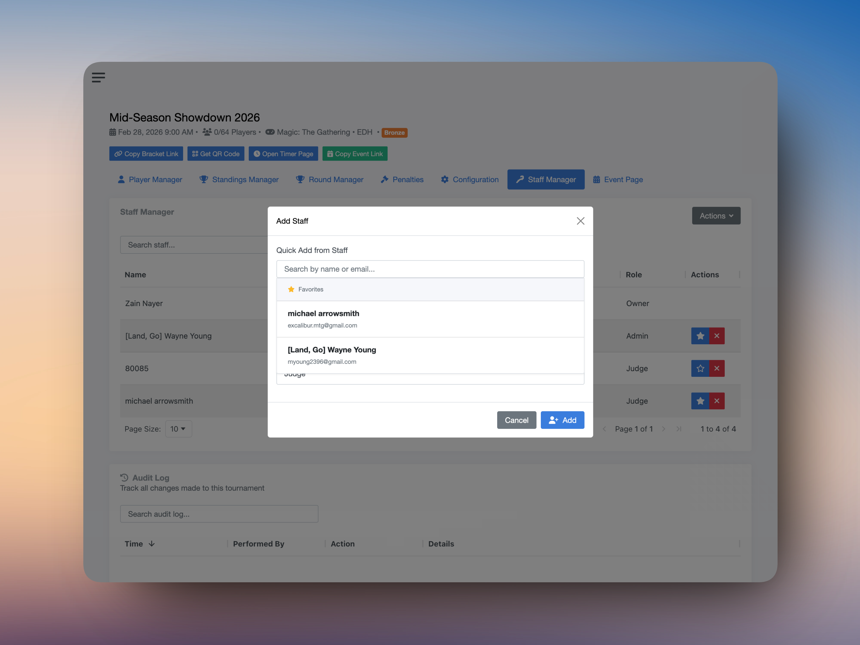 Managing tournament staff should be quick and painless. We've heard your feedback about the friction of adding the same judges and admins to every event, and today we're rolling out some quality-of-life improvements to make staff management effortless.